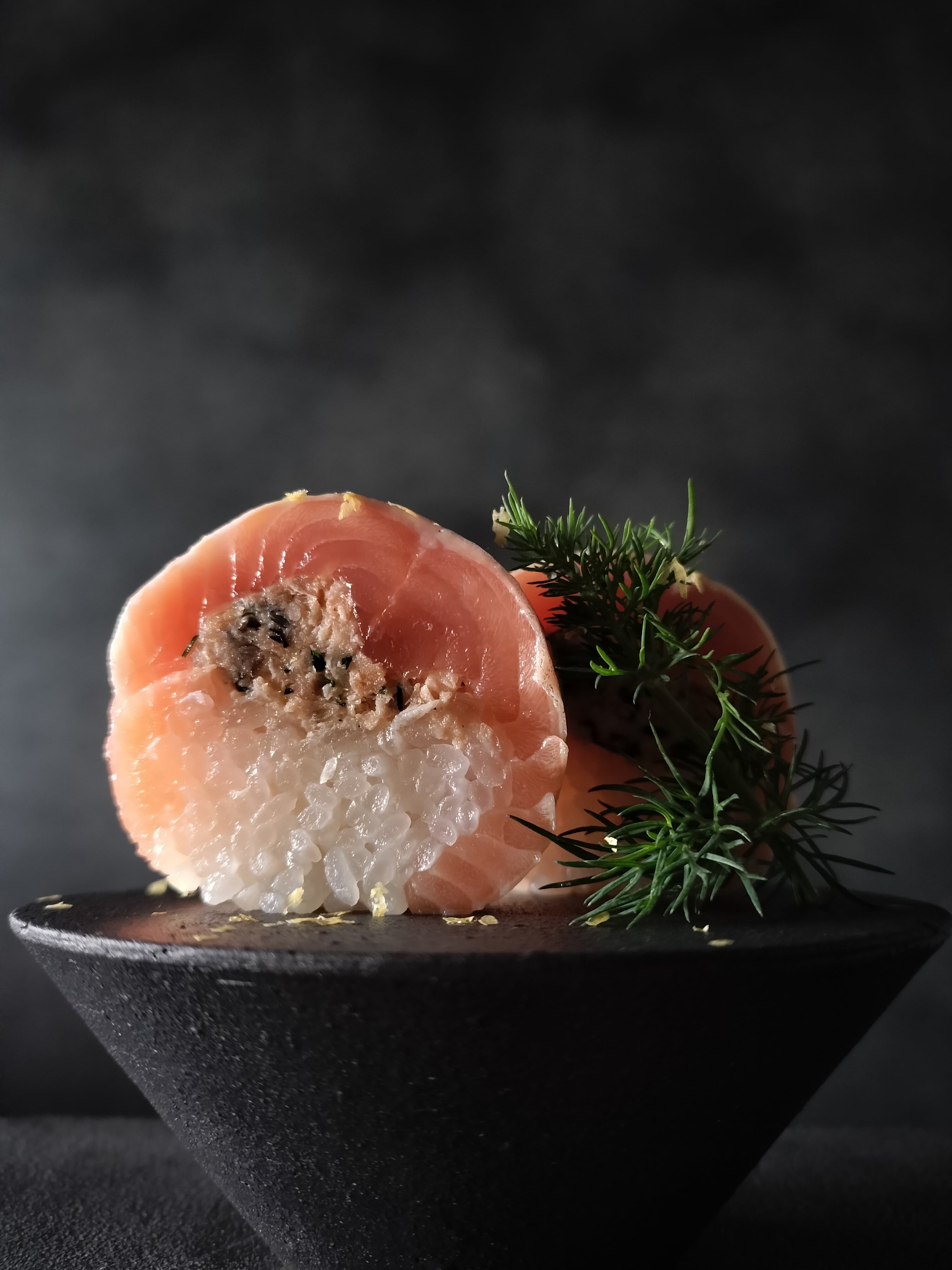 中には香ばしく煎ったサクラマスおぼろに鳴門昆布で〆た玉ねぎ、塩漬けハーブ、玉ねぎ佃煮、レモン黄身酢を合わせたサクラマスタルタルを詰め込んでいます。